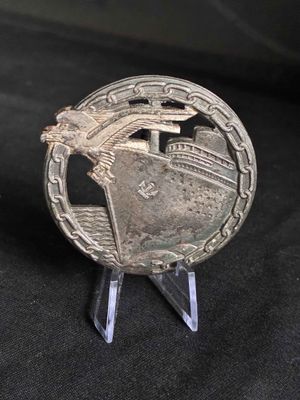 constructed of silvered and patinated tombak.consisting of a circular chain wreath around a central depiction of a blockade runner cutting through waves,with its bow overlaid by a german national eagle clutching a swastika.block hinge and banjo style pin with flat wire catch.desighner marked OTTO PLACZEK BERLIN.maker marked,SCHWERIN BERLIN. is in very good condition.geniune