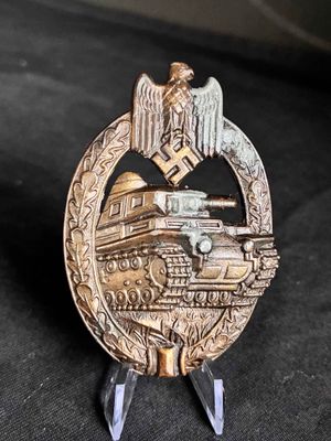 This panzer assault badge in bronze retains nearly all of the original bronze with some minor areas of zinc.Marked AS on the reverse and a rather rare earlier style variant which was found to have a very fragile catch so production was redesigned and a new hardware combination was released.the catch was broken on this one and repaired.this is the original catch and not a replacement so will be a period repair.produced in zinc.a nice bright example.Click on pay by credit card to activate after pay