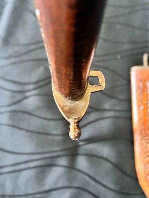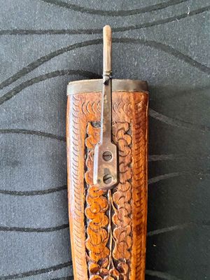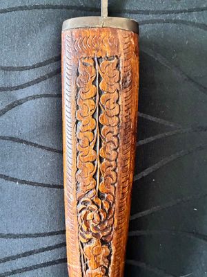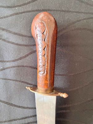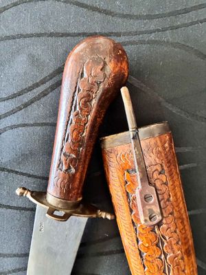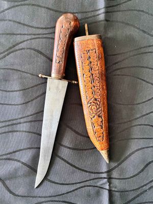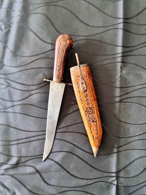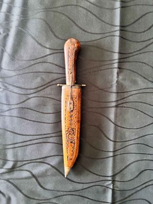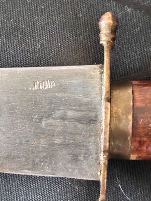 Magnet blade with India stamped on it.Brass cross guard with a unusual brass mechanism to hold dagger into scabbard.Very nice wood work on the grip and scabbard.Blade has been sharpened.As far as can find out these daggers were worn by soldiers guarding royals in different provinces in India.Each province had a different type of dagger..I would think the are more of a ceremonial dagger than a actual fighting knife.Something different for the collector.