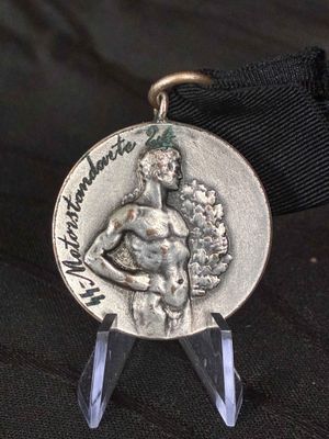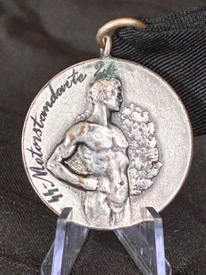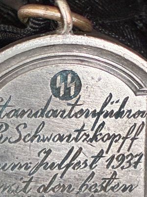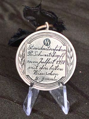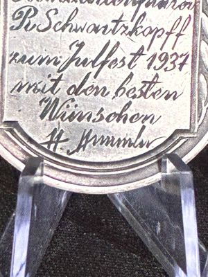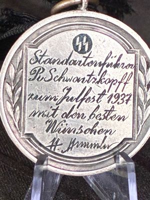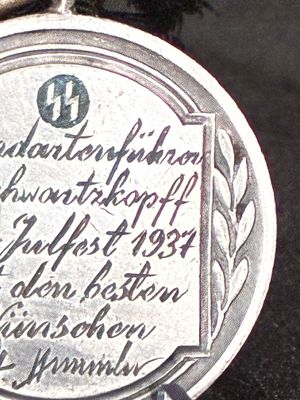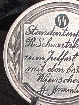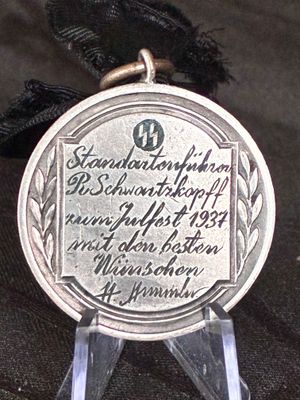 SS Motorstandart 24 was a small unit of SS personal that did driving duties for high ranking SS personnel.The medal was presented by himmler on a JULFEST holiday which was basically the SS Christmas.Table medals, porcelain pieces etc were also given as gifts.This medal is engraved to the highest quality and presented to SS STANDARTENFUHRER R.SCHWARTZKOPFF. JULFEST 1937 H.HIMMLER. A seldom seen medal with ribbon.Excellent Condition.