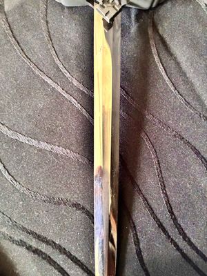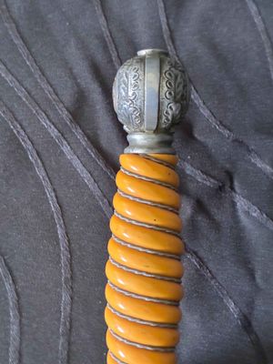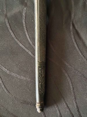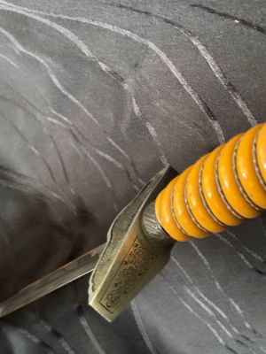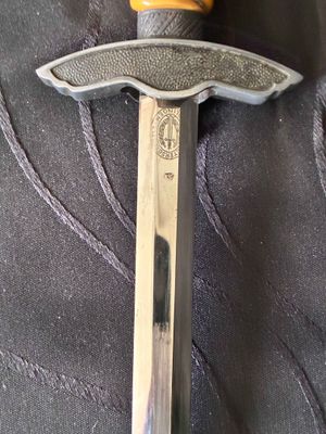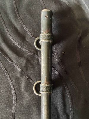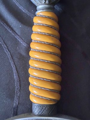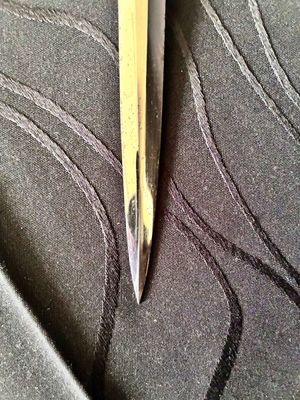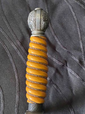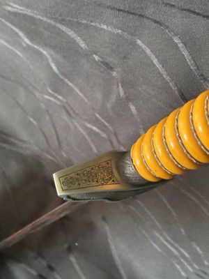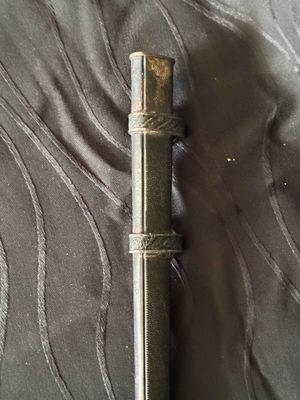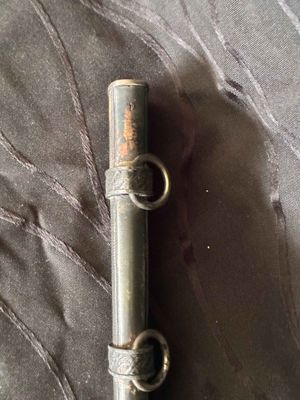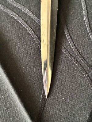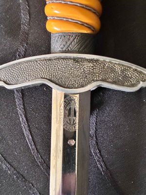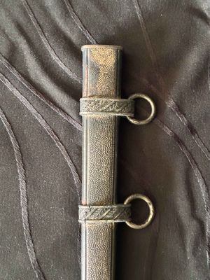 No nicks, chips or sharpening to the blade. On the reverse is a perfectly executed makers mark.Grip has a nice light orange colour with no cracks or chips. The pommel, ferrule, and crossguard have taken on a patina over their surfaces, with all 3 components matching.Scabbard shows fantastic patina and has no dents or dings ,note lower scabbard ring is loose but would be a very easy fix.