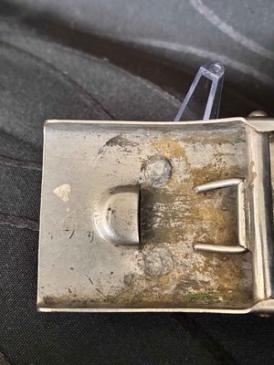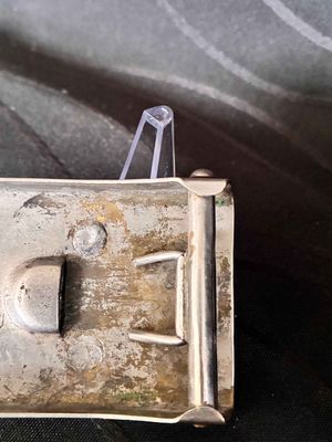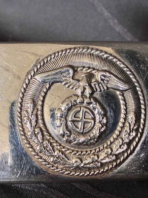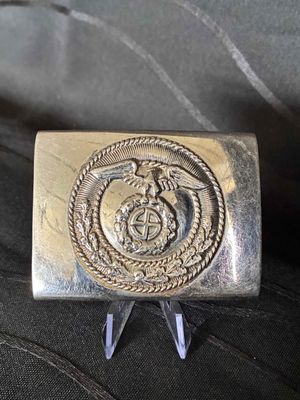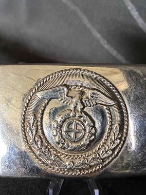 An early scarce NSKK belt buckle, die stamped nickle plated construction. The design is identicle to the SA buckle in brass, but in bright silver for the NSKK motorised section. The nickle plating is 98% intact with nice bright finish, with nice patina. The reverse of the buckle is unmarked, and has no damage or repairs in very good condition. Click on pay by credit card to activate after pay