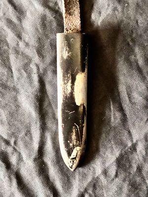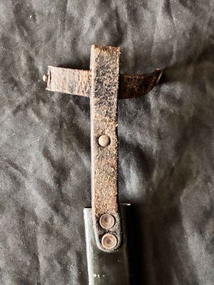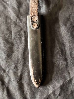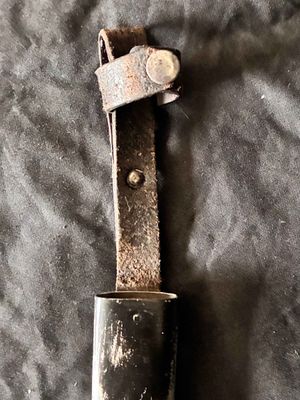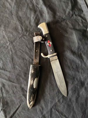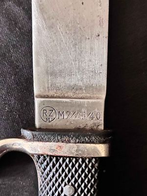 Original WWII German Hitler Youth Knife . RZM M7/40 Hartkopf & Co., Solingen The blade is very nice has some loss to the RZM mark. The hilt has about 85% of the original nickel plating remaining, The grip plates are the black checkered variety and are in very good condition. They are retained by steel nickel plated rivets with dressed obverse heads. The enamel grip insignia is bright and very nice (see photos) . The blade is good with some slight scratching and wear. The blade is RZM mark is worn from going in and out of the scabbard. Very nice scabbard has some paint loss, with the leather in very good condition, the snap is intact.