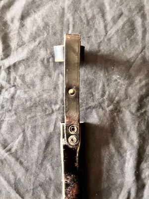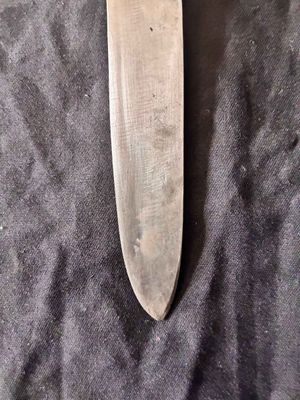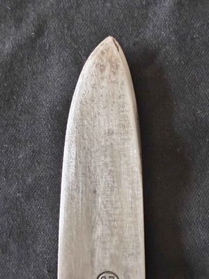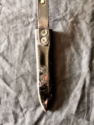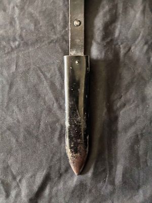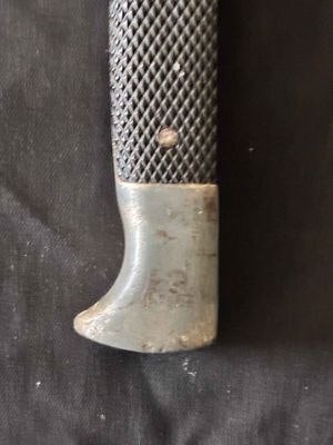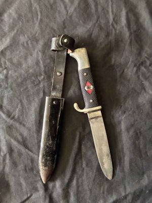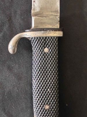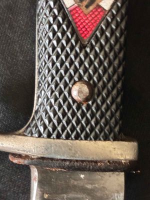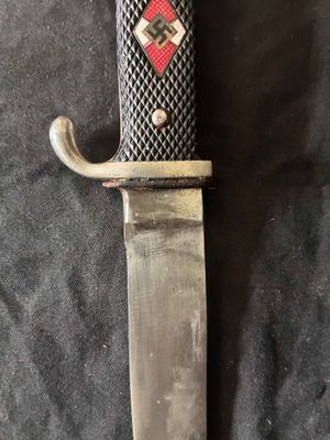 Waffenfabrik, Solingen-Wald. The blade does show light wear and age, with light graying along most of its length, as well as normal runner marks. Some cross-graining remains visible. The reverse of the blade is maker marked. This knife has a wonderful handle, with undamaged bakelite grip plates. The inlaid Hitlerjugend diamond emblem retains all of its original enamel. The quillion and pommel are nickel plated, with no lifting of the finish, and only light patina. This HJ knife is complete with its original scabbard. The scabbard retains most of the original, factory applied glossy black paint, with light wear resulting in some paint loss near the tip. The leather belt loop is complete and sound, and remains pliable, with a functional retaining loop with snap.