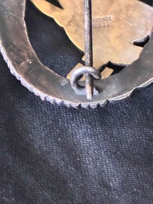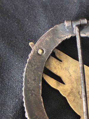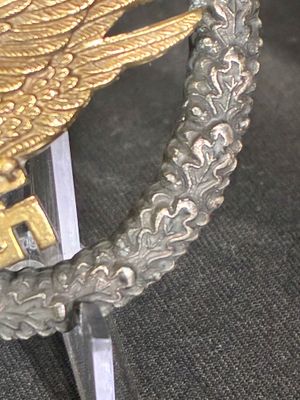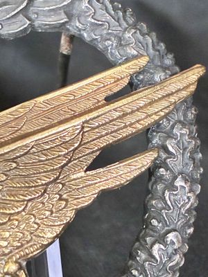 Gold finished eagle on blackened wreath with worn oak leaves on the high spots.On the reverse, the eagle is secured by two rivets with the maker's mark clearly visiable "C.E. Jucker, Berlin S.W" complete with a classic barrel hinge and round wire catch..Badge is non magnetic as it should be case has Fallschirmschutzen=Abzeichen on faded gold leaf lettering to the lid. Case shows handling wear, and fading but hinge works fine. The decoration measures 42.70 mm (w) x 53.10 mm (h); weighing 38g. The wreath has a slight concave appearance,therefore just very good not mint.