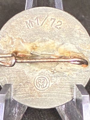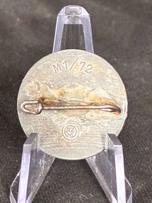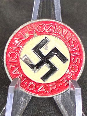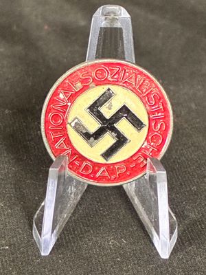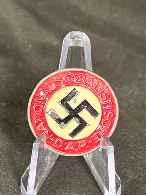 TR Era political pin.Black, white and red painted zinc construction Good working pin and catch setup . Marked RZM M1/72 for Fritz Zimmerman, Stuttgart. More Uncommon, late war NSDAP member’s pin