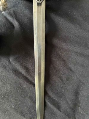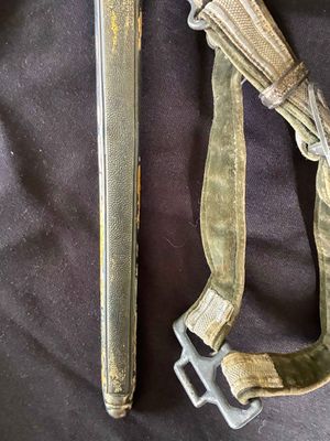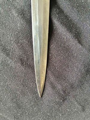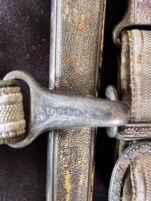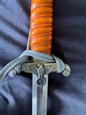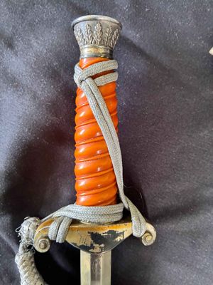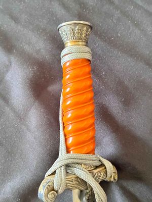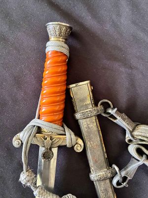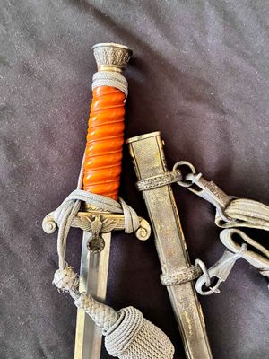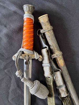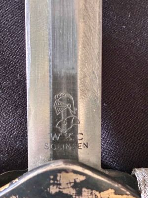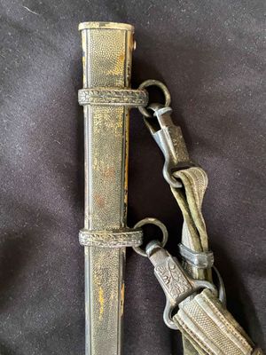This WKC Army Officer’s Dagger is very good with nice detailed fittings.The pommel of this dagger is in good condition, showing a little wear around the rim but nothing bad. The standing oak leaves and acorns are well detailed and have good backgrounds. The crossguard retains some silvering and has a fine definition. The details throughout the characteristic WKC eagle are ok throughout the head, breast and wing feathering, talons and wreathed mobile swastika. The grip is a nice darker orange color, This grip is in very good condition with no splits or chips. The scabbard is a WKC example that does show wear and one small indentation about halfway up.The carrying bands have an excellent pattern of overlapping oak leaves and acorns, with hand enhancing evident on each of the leaves. This blade does show some of original cross grain remaining and so called in out marks , the edge has a couple small edge defects but only to the touch.The reverse ricasso of the blade is etched with the Knight Head trademark of the WKC firm, and a large size leather blade washer is in place. The logo reads “WKC SOLINGEN.” it still has the silver portepee knot still attached and a beautiful pair of hangers marked D R G M as well. This set is uncleansed and has an amazing layer of undisturbed patina throughout.Nice solid undisturbed WKC dagger.