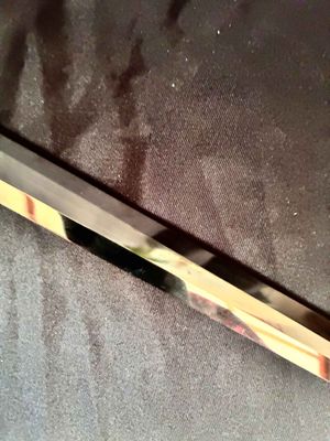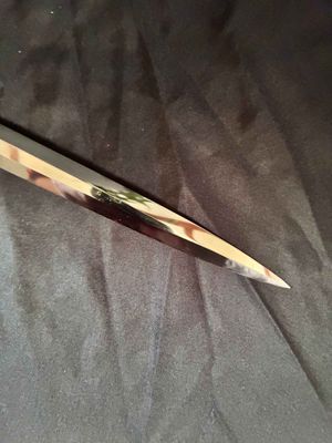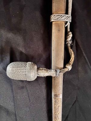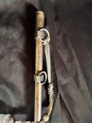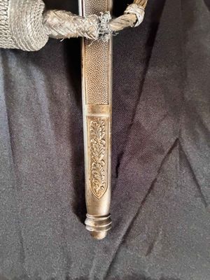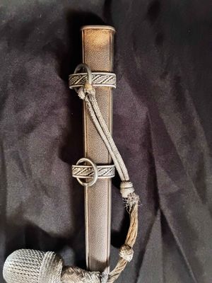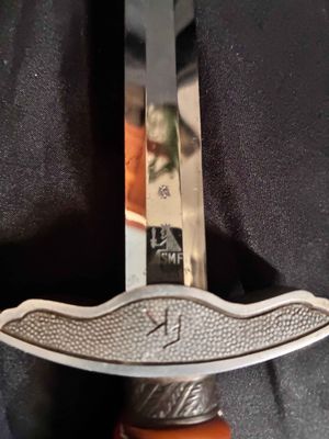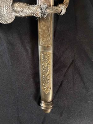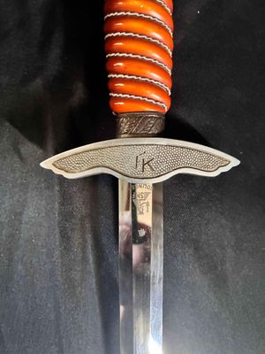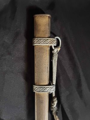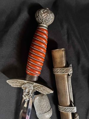 That wrap is firmly in place and remains tight into the turned grooves. As for the other components consisting of the pommel,and crossguard, all have taken on an undisturbed patina over their surfaces. And speaking of crossguard, the reverse of it has been personalized with the Luft officers' initials "FK". . The scabbard to this dagger remains straight, void of any bends, dings, or creases. The surface has actually taken on a gold appearance as a result of the factory lacquer which has yellowed over the last nearly 90 years. Both scabbard bands are firmly in place and hold the hanger rings properly. A perfect factory plated blade completes the description of this edged weapon. It remains full length, straight, void of any sharpening, tipping, or cutting-edge chips. , the king logo, a trademark of excellence with Luft edged weapons in particular, is shown on the reverse of the ricasso. Above it is the Waffenamt eagle stamp.