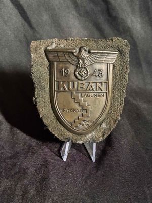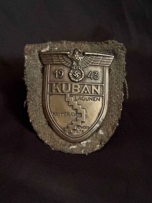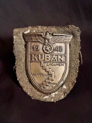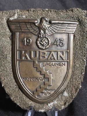 Heer Kuban shield - unknown maker. 1943 Kuban shield with 4 side prong setup, green heer cloth, paper on the back plate .Remains in perfect mint condition with excellent two tone bronze finish on the shield.no scratching or dents.click on pay by credit card to activate after pay.