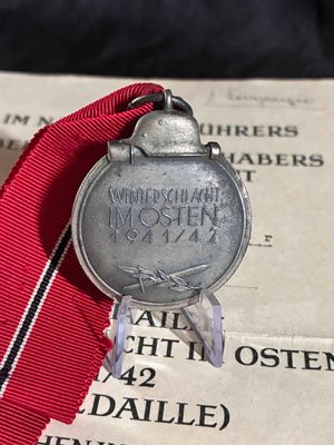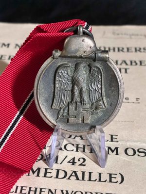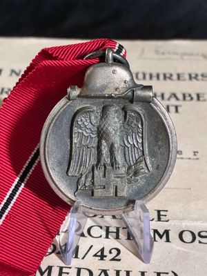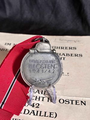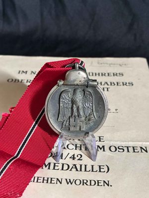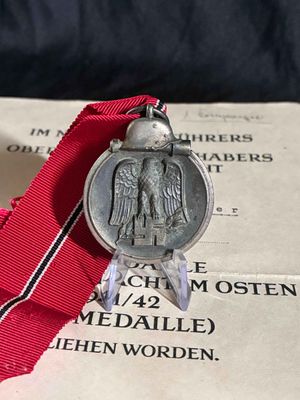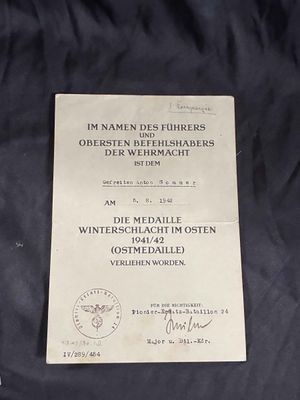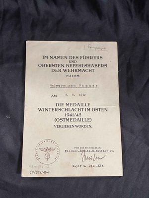 Private Anton Sommer - Infantry Regiment 446 Original certificate for the "Winter Battle in the East" ( eastern front medal)Medal with ribbon. marked 7 on the ring for Meybauer of Berlin. .
