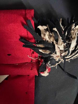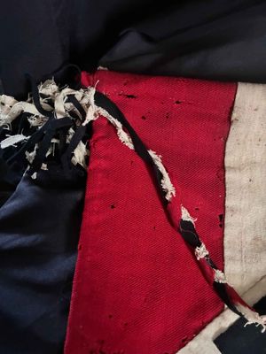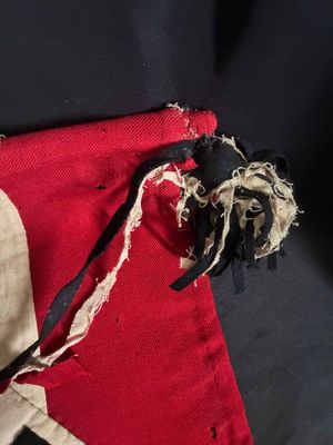 The original hanging rod is still intact; the black-and-white twisted hanging cord and matching tassels are intact.There are some holes mostly on the red sides and minor discoloration throughout. Aside from its flaw, this retains great history and not often found.