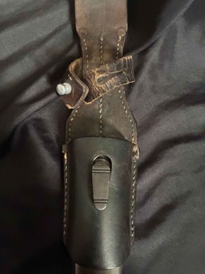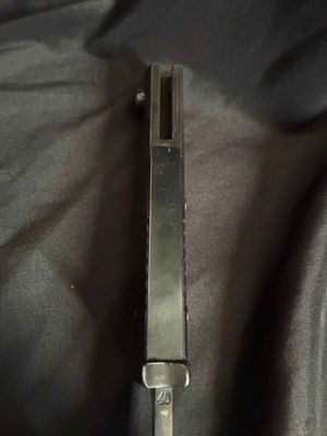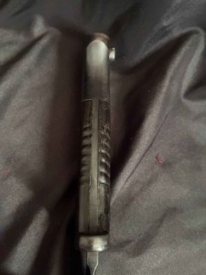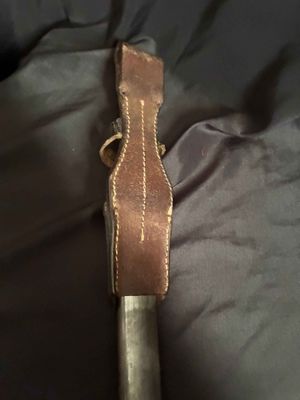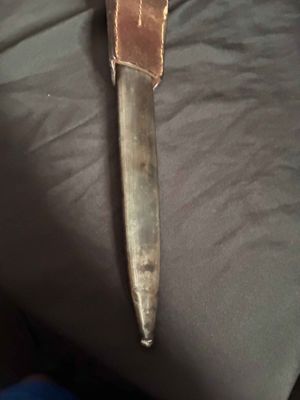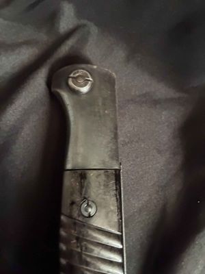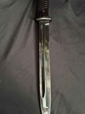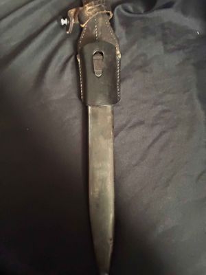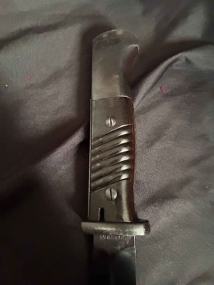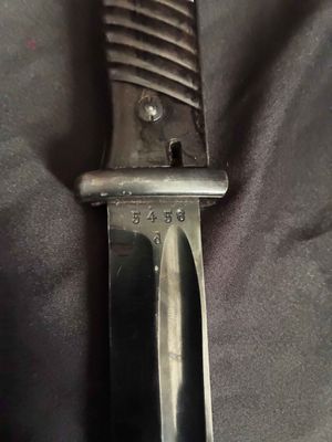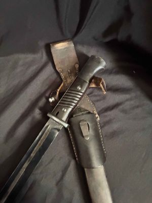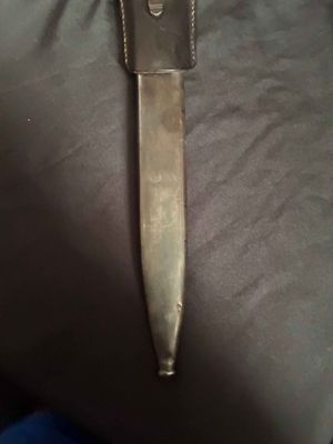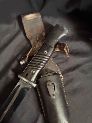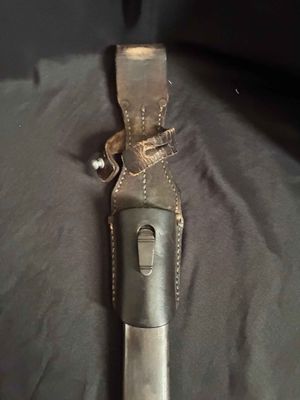 German WWII 98K Bayonet by Mundlos. This is a not a matched example but very nice. This is a fantastic late war example. The steel fittings are excellent as are the slotted dark brown bakelite grip plates. The anodized scabbard is in very good condition. The throat of the scabbard is marked 1988. The blade is excellent plus . The serial number 5456 d can be seen under the crossguard. The Blade is marked for Mundlos under cross guard Complete with a dark brown leather frog.