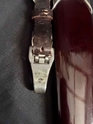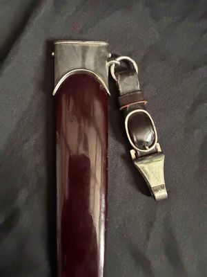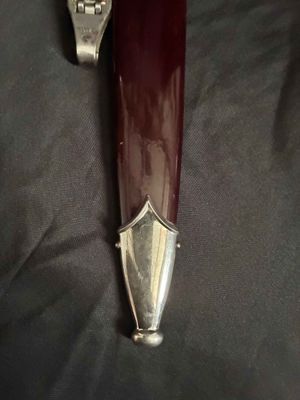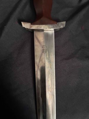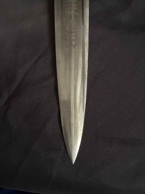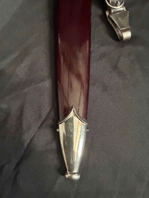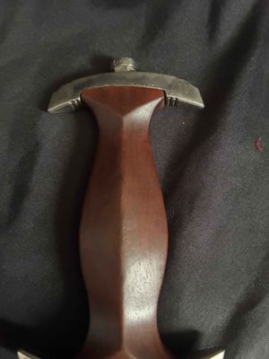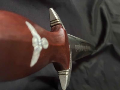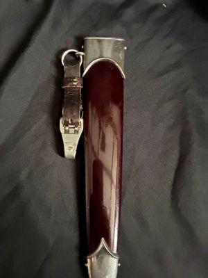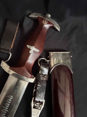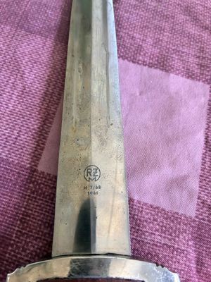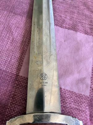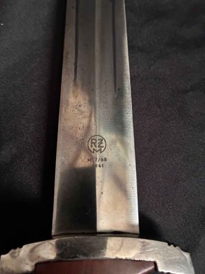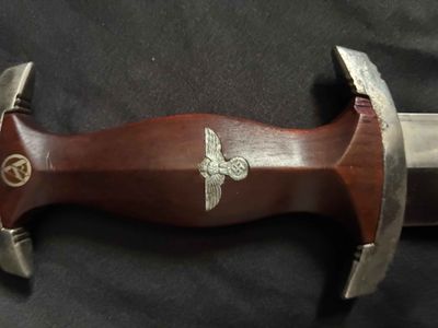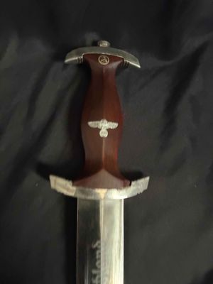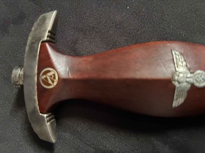 TIGERWERK. German WWII SA Dagger with 3-Piece Hanger by Tigerwerk. This is a RZM example with nickel plated fittings remaining 95% intact. The grip fit is slightly loose and we have not attempted to tighten it. This includes an aluminum eagle along with the enameled runic SA button. Both are in very good condition. The original brown paint on the scabbard is a conservative 95% intact. The blade is in full excellent condition with deep motto on obverse, and the company's RZM code M7/68 and date of production, 1941. You can see the faint cross graining .Comes with a three-piece hanger . The hanger is RZM marked, as is the snap clip marked for RZM M5/25 for C. Th. Dicke. Overall, this is in excellent condition.