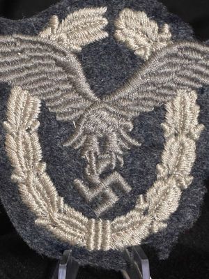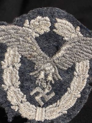 Luftwaffe Observer Badge in cloth. These are a fraction of the price of their metal counterparts. Machine embroidered on dark blue wool.looks like it may be a removed example.