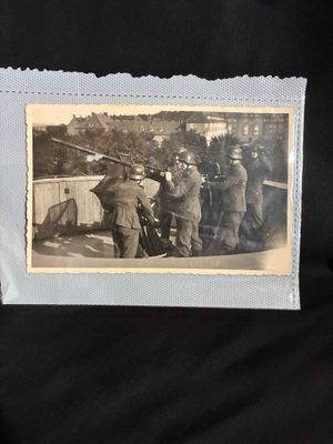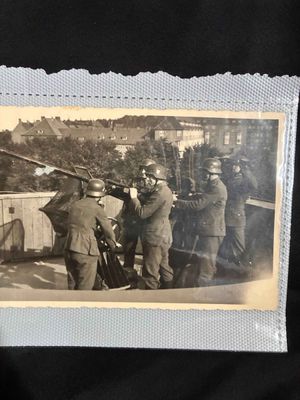 GERMAN WW2 3.7CM ANTI AIR GUN & CREW ON TOP OF THE FLAK TOWER B&W