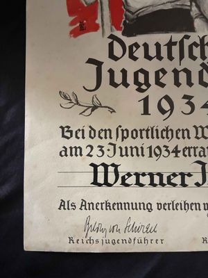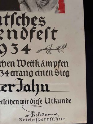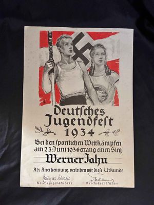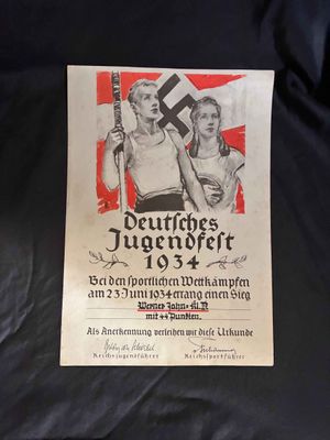 . Nice and in very good condition Hitler Youth award document for the Deutsches Jugendfest 1934. Hitler Youth award document.2 documents listed