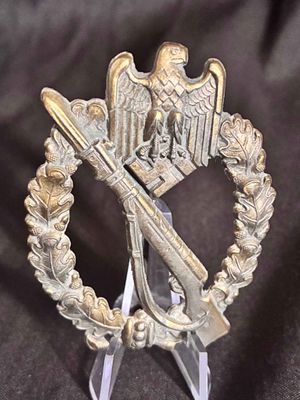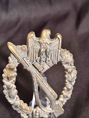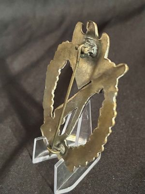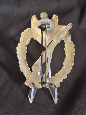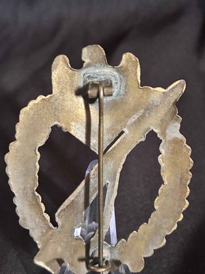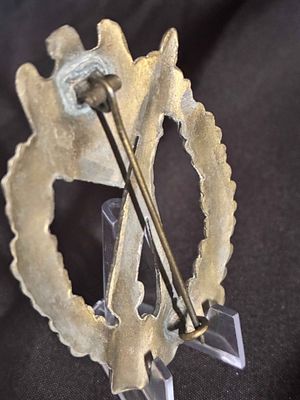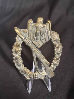 Gablonz….. Infantry assault badge in bronze . Mid to late war semi hollow zinc construction with RK design and crimped Gablonz setup. Remains in unworn excellent condition with only some fading of the finish as photos show……