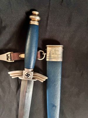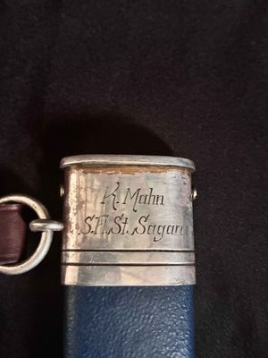 RARE NAMED DLV dagger made by GEBER HELLER. To have one that is personalized is very rare. The name K Muhn appears on the scabbard along with the City of Saint Sagan Which no longer exists. It is now under a different name in poland.Stamped GEBR. HELLER, MARIENTHAL, b. SCHWEINA/THR.