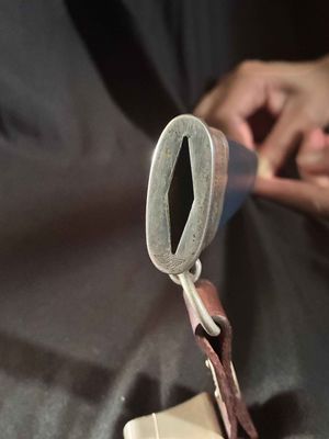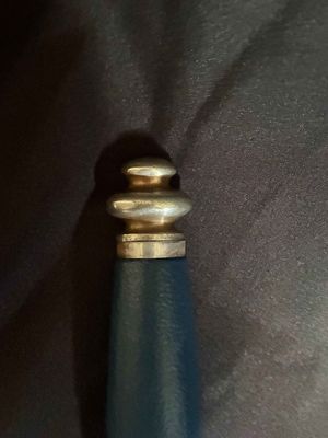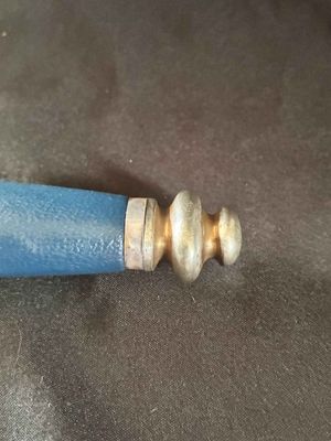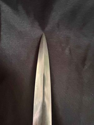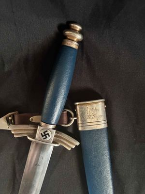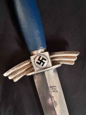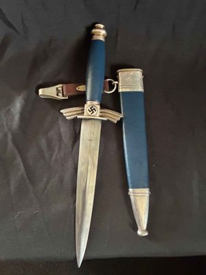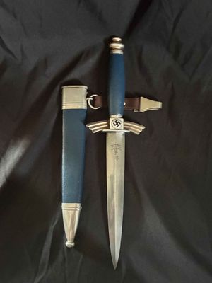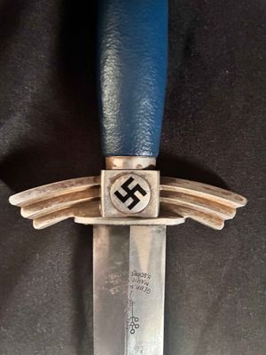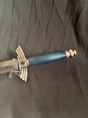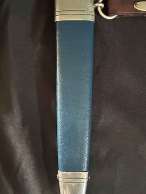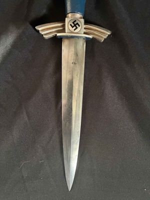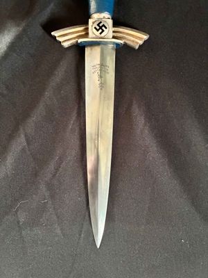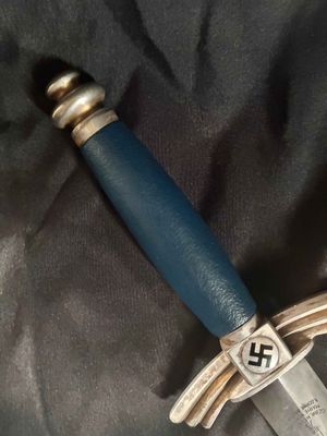 The bright blade on this one looks unpolished no sharpening or chips,It has a sharp tip and is solid fit. The original blue pebbled leather buffer pad continues to remain intact. This Dagger features all nickel silver fittings, and all the Moroccan blue leather is in excellent condition.The solid nickel-silver scabbard fittings have a great look as the silver plating has patinaed to a nice silver gray. . The throat has the DLV logo. The scabbard/dagger fit is perfect. The solid nickel-silver hilt fittings look excellent, perfectly matching the scabbard fitting in color, wear and patina! The end of the crossguard is also inspection stamped on one end and is "K" caster marked. The black enameled swastikas are practically perfect! Finally, the original hanger is intact with a well working clip.