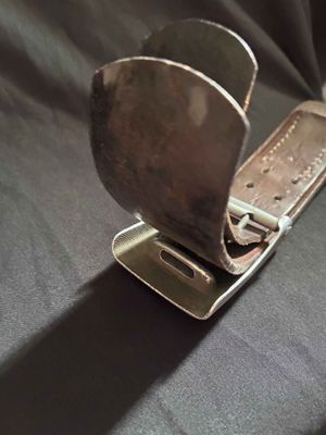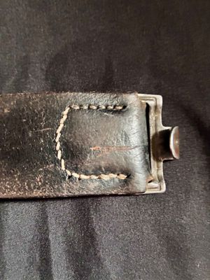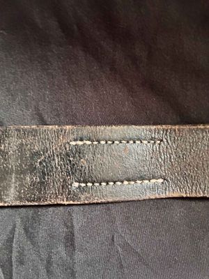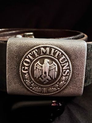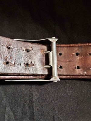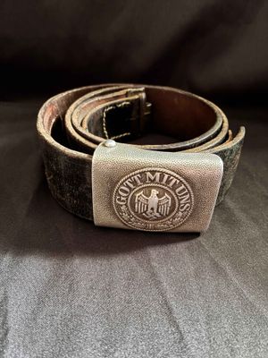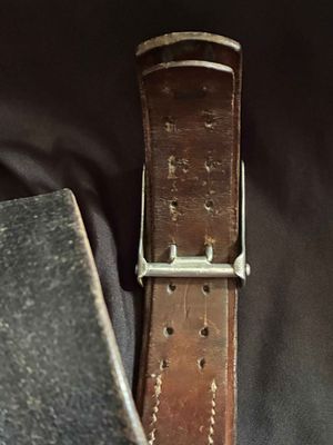 AND BUCKLE……German WWIl Army Belt This heavy duty black leather belt shows some wear as it should, but is not damaged in any way. It measures 96 cm.The tab of this belt is nicely marked with the date 1943. This has a nice aluminum army buckle. It has a pebbled field. The motto, wreath and eagle do show some wear .This has an integrated catch, and an aluminum rollbar. Overall, this is a very good set.