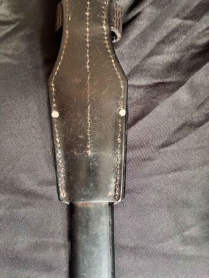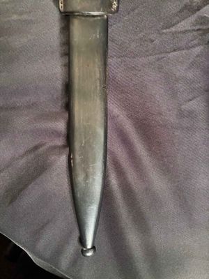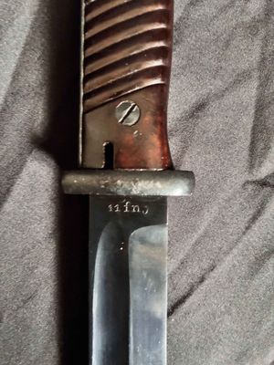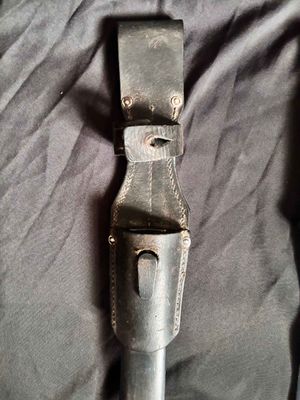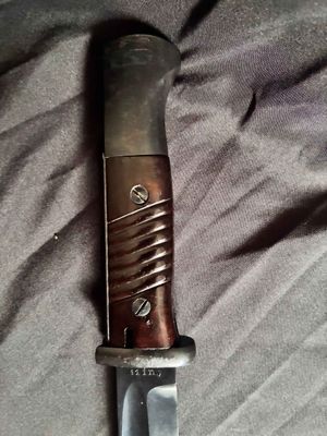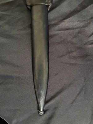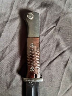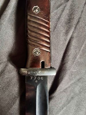 Alexander Coppel GmbH, Solingen. The number "4" followed by "fnj" indicates the date of manufacture as 1944. Serial number 7706 a.Scabbard 7422.Excellent plus blade with blued steel blade and dark bakelite (plastic) handle grips.Scabbard is in very good condition showing no real dents or major scratches.leather frog is also in very good condition with that old leather smell to it.markings on leather frog and pommel and push button.Top quality k98 with a near perfect blade just a pity it’s not a matching set……