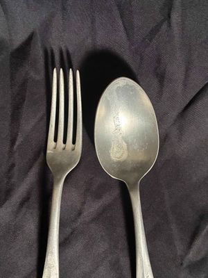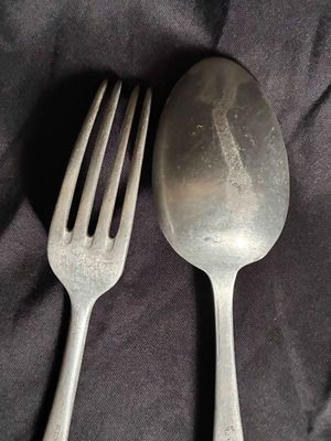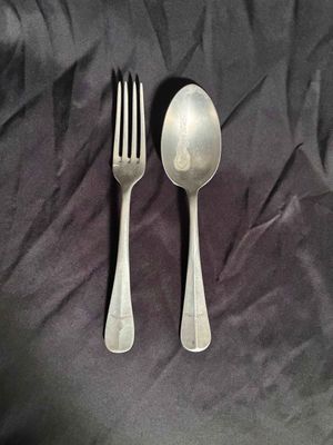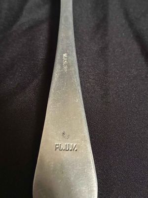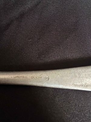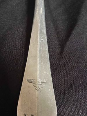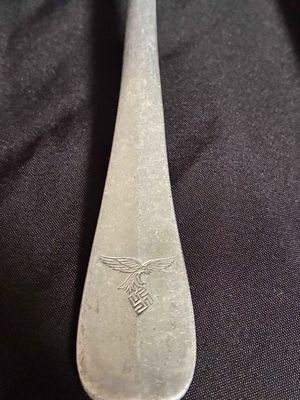 . . One dinner fork constructed of aluminum. stamped with Luftwaffe eagle clutching a mobile swastika. marked with the logo of Hessische Metallwarentabrik, Ziegenhain…2. One table spoon, constructed of aluminum, the obverse showing a stamped Luftwaffe eagle clutching a mobile swastika and a Luftwaffe Flight Barracks Administration (FL.U.V.) mark.maker marked with the logo of Wilhelm Jordan, Solingen, with a manufacture date of 39