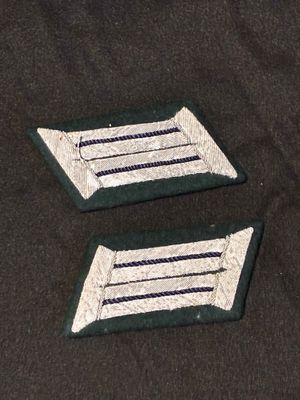 A Heer Medical Officer’s Collar Tabs; hand-embroidered in silver-grey thread on green wool backing, with two embroidered stripes . The reverse comes with buckram type stiffener, in excellent condition.