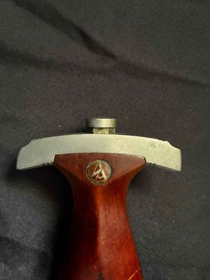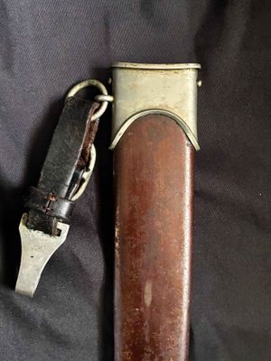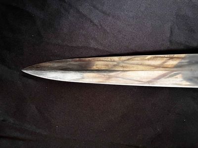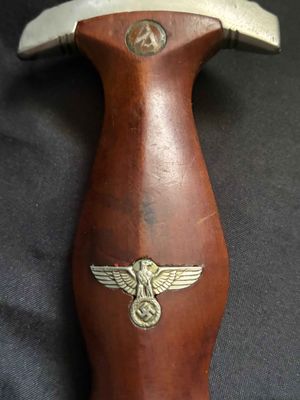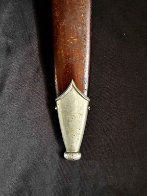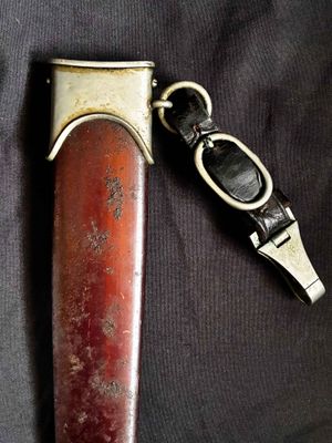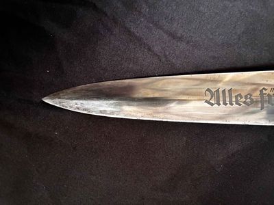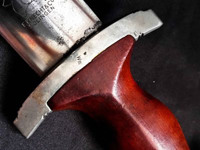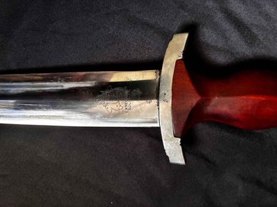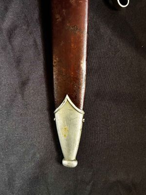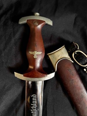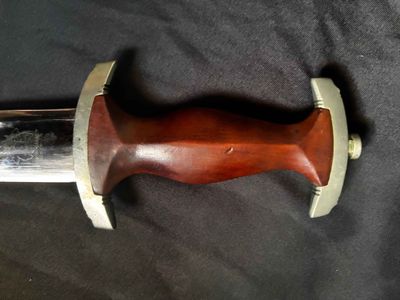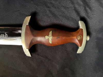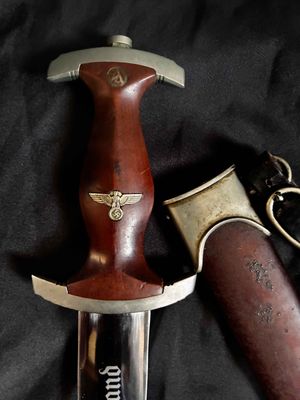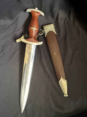 Early E. Knecht SA Dagger(rare)… This one rates 6 out of 10 on the SA Rarity rating. The blade rates a very good but does show dots or age and in/out marks. The brown anodized scabbard shows wear but does remain dent free! The solid nickel scabbard fittings look good with some small hits from normal wear and nice matching patina. The ball is dent free tho .All four screws remain intact! The scabbard | crossguard fit is good The solid nickel crossguards are in excellent condition. The reverse of the lower crossguard is marked "Wm" (Westmark). The stamp is on a 45 degree angle, which is unique.The brown toned hardwood grip is chip and free, it does has small bumps and a couple of small scratches, again exactly what we expect to see on used original examples. The solid nickel eagle is beautifully detailed with a perfect fit. The SA roundel is just good.The acid etched "Alles fur Deutschland" motto and E. Knecht & Co Solingen maker mark are nicely done.This is one of the rarer makers of SA dagger and while not a mint SA dagger it is to me one that has been worn and used in whatever duties the owner preformed.Good honest SA dagger .price reflects rarity.