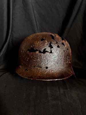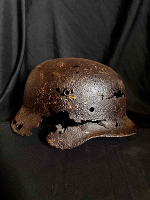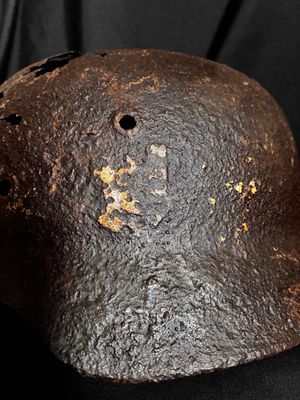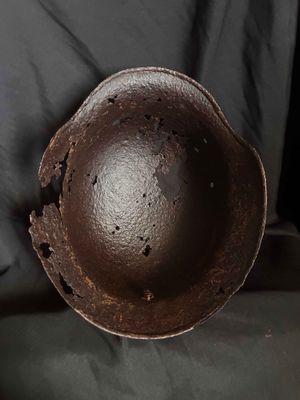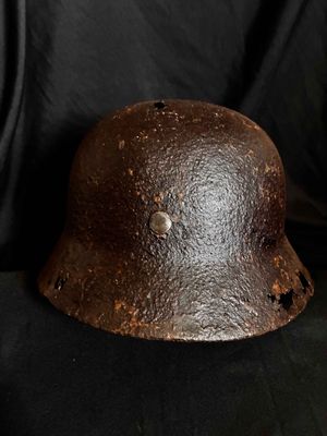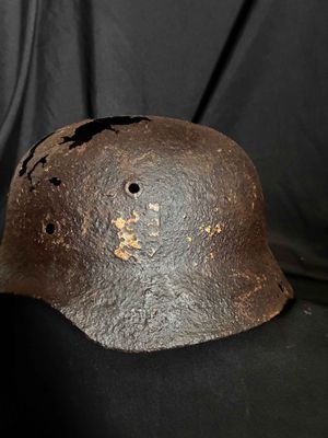 .WW2 German relic helmet preserved with paraffine…Obviously Ground dug.Purchased from the Netherlands with owner stating it was from Stalingrad,but who knows,more likely around Normandy,France etc.Still has one of the split pins intact and showing decal traces