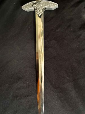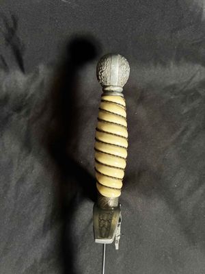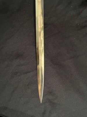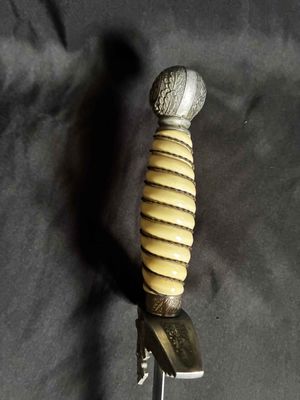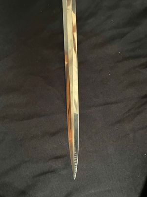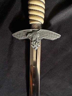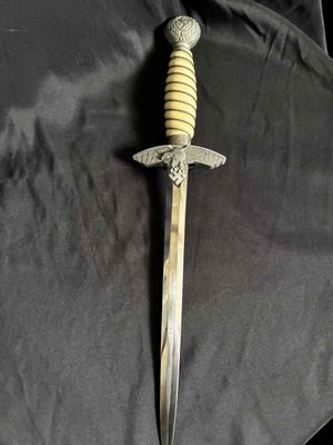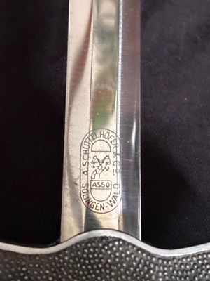 Solingen. the celluloid grip of this dagger is still the original ivory white color, which rare to see. It has a nice slightly tapered shape, and is bound with bullion wrapped twisted no cracks, chips, or other issues. The hilt mounts are in very good condition.Cross guards look good with great detail.Blade is in excellent condition with cross grain showing and excellent maker mark.Scabbard and bands are mint,no scratches or dings.